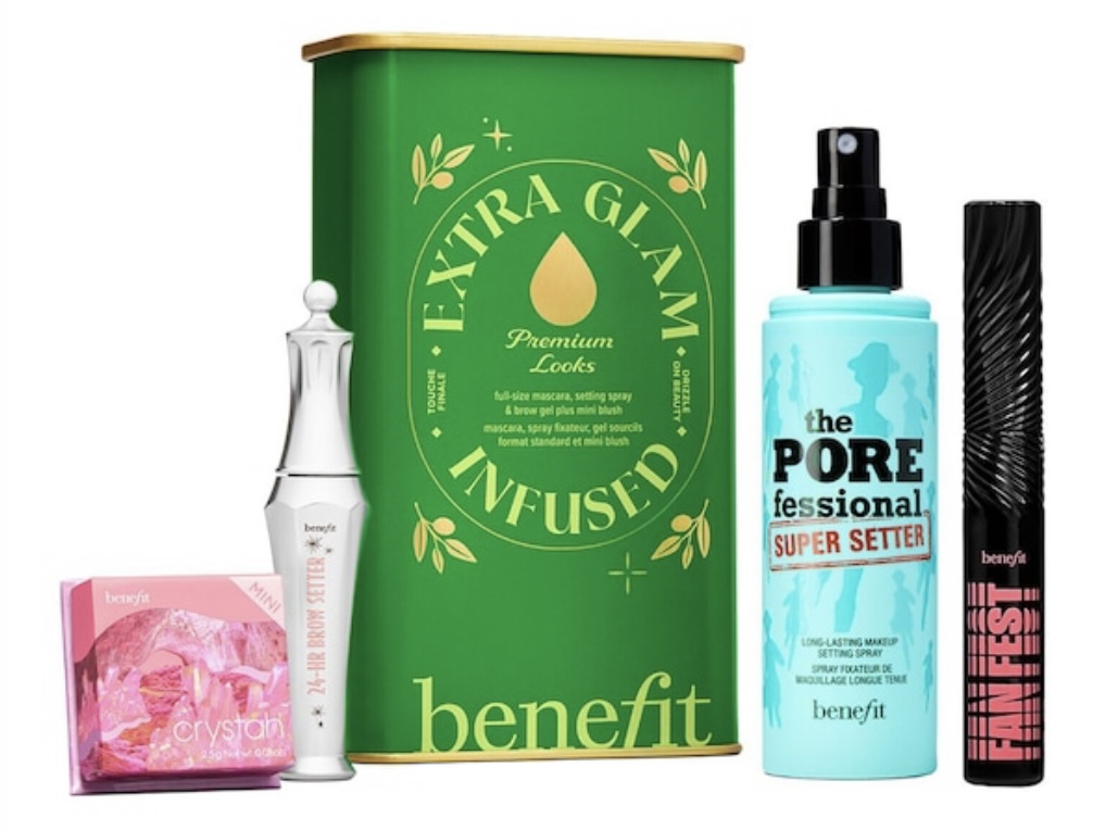 El estuche de maquillaje Extra Glam Infused de Benefit incluye una máscara de pestañas, un spray fijador, un gel para cejas y un rubor.