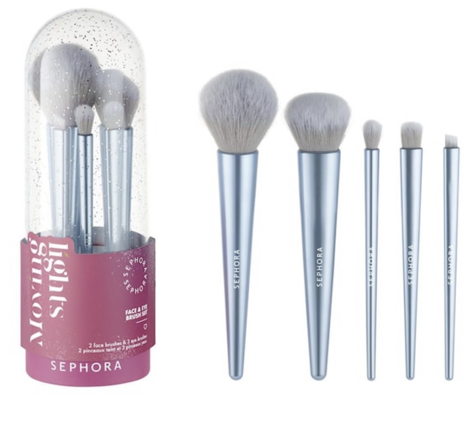 Un kit de 5 pinceles de maquillaje esenciales + un soporte redondeado con un look brillante.